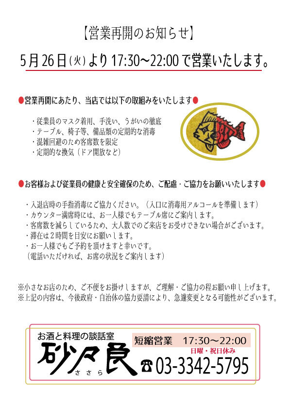 新型コロナウイルス感染症(COVID-19)対策で営業自粛しておりました砂々良(ささら)ですが、営業再開いたしました。