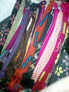 祖母の羽織紐。使って古びてるのもあるけど、祖母のだと思うとそれもいとおしい。入ってた小桜の箱もかわいい。しっかりした作り。