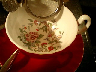ティーカップも砂糖壷もかわいい。とき緒さんは薔薇のシフォンケーキ。わたしはショートケーキ。