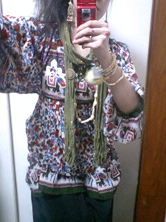 メールで相談したところ「fujimiya.tvのイメージカラーは赤黒だから、布多めのじゃらじゃら民族系じゃないですかね」と大島さんに聞いて、前日まで試行錯誤の結果、赤白黒緑なトライバル風につくったところ。