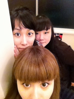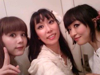 楽屋で衣装にて。写真ではわからないけど、おそろいに髪飾りのお花とネックレスをしてます。