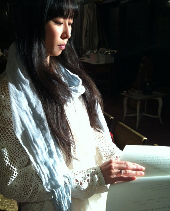 照明デザイナー、という名前をわたしは初めて聞いたのだけれど、建築照明という、空間演出のお仕事から、いまは舞台やアーティストの光演出協力などまで活動を広げたのだそう。今年の宝生流能楽公演「体感する KANAWA-鉄輪-」空間演出で郁さんと意気投合したのですって。わたしもその舞台、見ました。能楽堂の、あの日常とは異質な闇の空間を演出したのが克奈恵さんだったんだなあ。人がほとんど闇に溶けてしまうくらいの、あの明かりを作れる人だから、今度どんな光り、闇をくれるのか楽しみです。