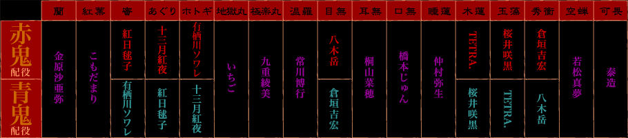 Wキャストで「赤鬼配役」「青鬼配役」がございます。わたしはどちらも紅葉(くれは)ですが、他のキャスティングは下記をご参照ください。