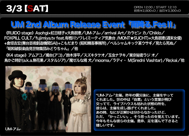 UM-¥¢¥à-¤ÎËÜÈ֤ϡ¢¥¹¥Æ¡¼¥¸¤ËÇò¤¤Ëë¤òÄ¥¤ê¡¢Åê±Æ¤¹¤ë±ÇÁü¤òÌÀ¤«¤ê¤È¤·¤Æ±éÁÕ¤µ¤ì¤ë¡£¾¯¤·Á°¤Ë¸«¤¿Á´°÷¿¿¤ÃÇò¤Ê°áÁõ¤Î»þ¤Ï½Ð±é¼Ô¤â¥¹¥¯¥ê¡¼¥ó¤Ë¤Ê¤Ã¤ÆÀ÷¤Þ¤Ã¤Æ¤È¤Æ¤âåºÎï¤À¤Ã¤¿¡£º£²ó¤ÏÆ£µÜ¤µ¤ó¤Èmidori¤µ¤ó¤¬¹õÇò¡¢¥ê¥«¥¤¤µ¤ó¤¬ÀÖ¡£¤ï¤¿¤·¤È²Ö¤ê¤ó¤Á¤ã¤ó¤ÏÇò¤¤°áÁõ¥¹¥¿¡¼¥È¤Ç¡¢ÅÓÃæ¤ÇÀÖ¤ËÃåÂØ¤¨¤ë¤È¤¤¤¦¥×¥é¥ó¡£¤À¤¤¤¿¤¤ÍÙ¤ë»þ¤Ïȱ¤ò¤¢¤²¤ë¤±¤É¡¢º£Æü¤Ï¤»¤Ã¤«¤¯¤Î¹õȱ¥í¥ó¥°½¸ÃĤʤΤǡ¢¤Þ¤Ã¤¹¤°¤ª¤í¤·¤Æ¡£